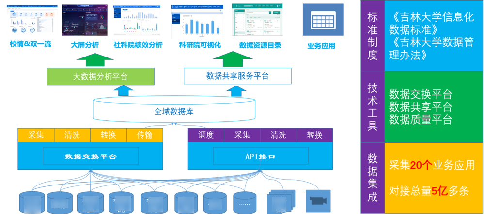 数据治理体系建设以来,大数据和网络管理中心结合学校实际情况,以“一张表”为突破口,针对信息资源的整合、对接和共享等问题,制定了《吉林大学数据管理办法》,编制了数据标准规范。在校内各部门、单位的共同努力下,数据体系结构持续优化,初步建成“采集、管控、治理、发布”一体化的高质量数据治理体系。