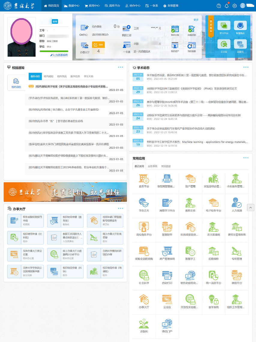 2022年11月,融入“新模式”“新格局”“新能力”的“三新”建设理念的融合门户平台上线运行,通过统一认证、融合门户和系统直通车,基本实现一套账号走遍吉大。融合门户采用“登录一账号、服务一站式、数据一张表、资源一平台”建设模式,立足“整合分散应用,集成数据资源,整体一盘棋”的新格局、大格局建设,持续提升数据在网信服务中的“主动服务能力、业务融合能力、数据计算能力”。通过融合门户,全校师生可直接跳转进入人力资源系统、教务教学管理系统、组织工作管理系统、财务系统、社会科学研究院科研管理系统、学工系统、云会议、科研院横向项目管理系统等56个业务应用,彻底改变以往应用分散、多套账号的状况,使之以一种融合的方式呈现于师生面前,也提高了师生业务办理的效率。